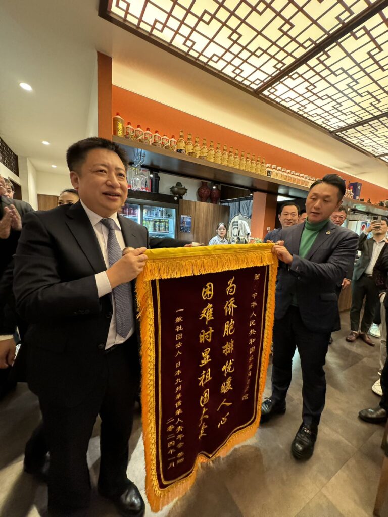 日頃のご支援への感謝の気持ちを込めた锦旗を中国駐福岡総領事館へ贈呈しました。